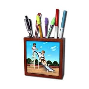 Vendor: Office Products Product Description : Children on a slide Tile Pen Holder is measuring 5w x 5h x 2d. Made from high quality solid mahogany wood with satin finish and one 4.25 commercial grade mirror gloss ceramic tile. Looks great on a desk or counter top with a full color custom imaged tile.