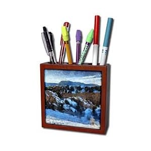 Vendor: Office Products Product Description : Colorado Mountains Wintery Sunset Tile Pen Holder is great on a desk or counter top. Made of high quality solid wood with a satin finish. Image displayed on one inset high gloss 4.25" x 4.25" ceramic tile. Overall size is 5" x 5" x 1 2/3" with 3- 1 1/3" top holes.