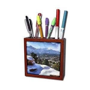 Vendor: Office Products Product Description : Colorado Mountains Snow and Pikes Peak Tile Pen Holder is great on a desk or counter top. Made of high quality solid wood with a satin finish. Image displayed on one inset high gloss 4.25" x 4.25" ceramic tile. Overall size is 5" x 5" x 1 2/3" with 3- 1 1/3" top holes.