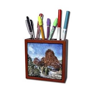 Vendor: Office Products Product Description : Colorado Mountains Rock Formation Tile Pen Holder is great on a desk or counter top. Made of high quality solid wood with a satin finish. Image displayed on one inset high gloss 4.25" x 4.25" ceramic tile. Overall size is 5" x 5" x 1 2/3" with 3- 1 1/3" top holes.