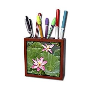 Vendor: Office Products Product Description : Pink Lotus Flowers and lily pads Tile Pen Holder is measuring 5w x 5h x 2d. Made from high quality solid mahogany wood with satin finish and one 4.25 commercial grade mirror gloss ceramic tile. Looks great on a desk or counter top with a full color custom imaged tile.