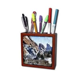 Vendor: Office Products Product Description : Colorado Mountains Rock Formations Tile Pen Holder is great on a desk or counter top. Made of high quality solid wood with a satin finish. Image displayed on one inset high gloss 4.25" x 4.25" ceramic tile. Overall size is 5" x 5" x 1 2/3" with 3- 1 1/3" top holes.