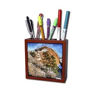 Vendor: Office Products Product Description : Colorado Mountains Tree and Large Rock Face Mountain Tile Pen Holder is great on a desk or counter top. Made of high quality solid wood with a satin finish. Image displayed on one inset high gloss 4.25" x 4.25" ceramic tile. Overall size is 5" x 5" x 1 2/3" with 3- 1 1/3" top holes.