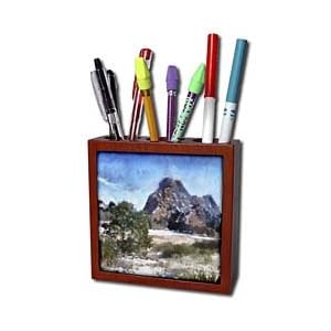 Vendor: Office Products Product Description : Colorado Mountains Ridge and Tree Tile Pen Holder is great on a desk or counter top. Made of high quality solid wood with a satin finish. Image displayed on one inset high gloss 4.25" x 4.25" ceramic tile. Overall size is 5" x 5" x 1 2/3" with 3- 1 1/3" top holes.