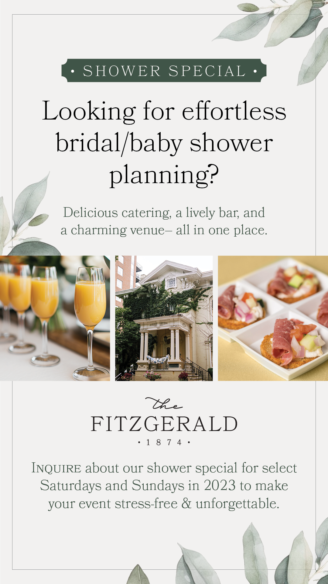 The Fitzgerald will make it an elegant, unique and stunning event to remember! Ask us about our shower special for select Saturdays and Sundays in 2023!