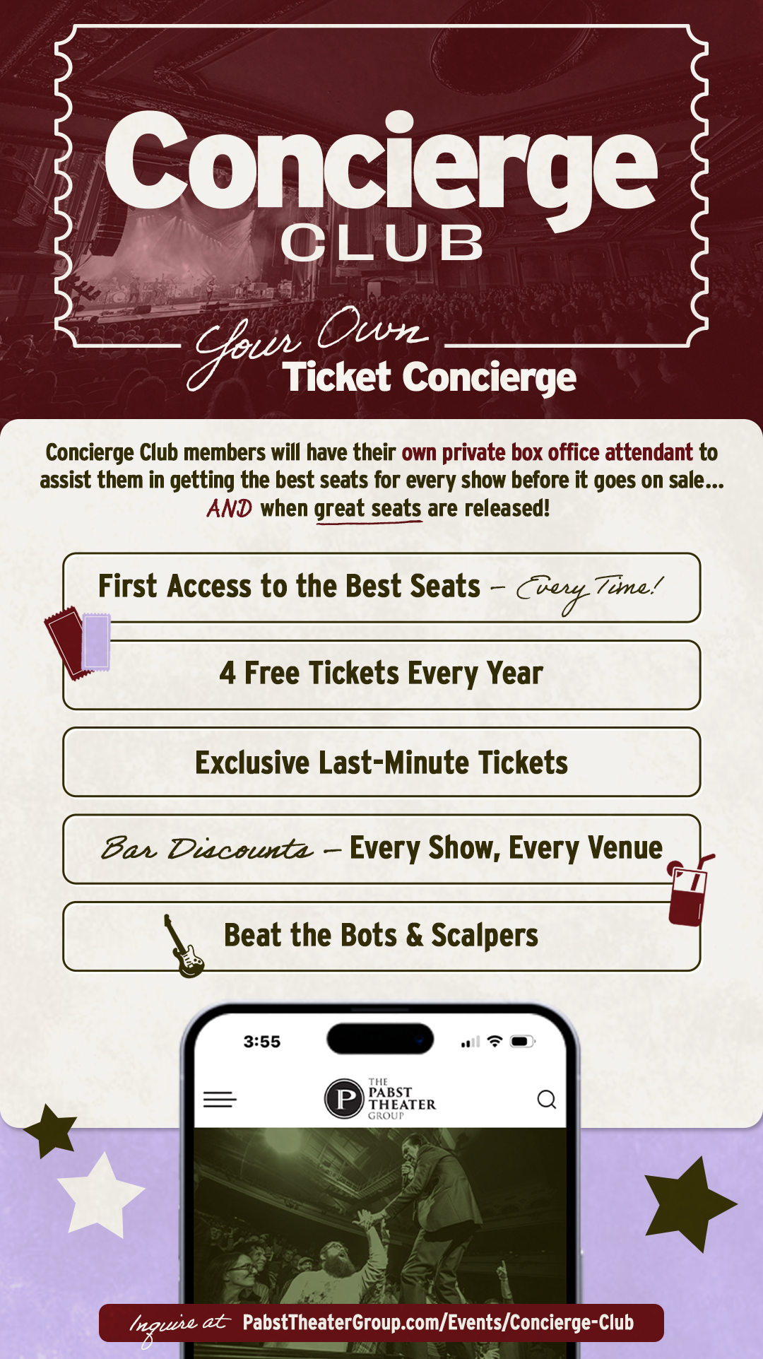 The Pabst Theater Group is excited to announce The Concierge Club. Your way to beat the scalpers on EVERY on sale!!