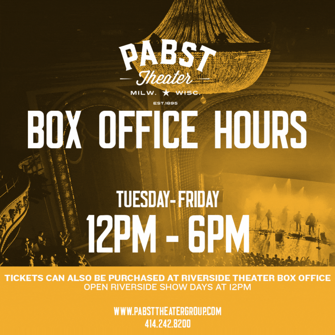 The Riverside Theater + Miller High Life Theatre Box Offices will be open on event days only, starting at 12PM. Turner Hall Ballroom and Vivarium Box Offices will be open 2 hours prior to show time on event days.